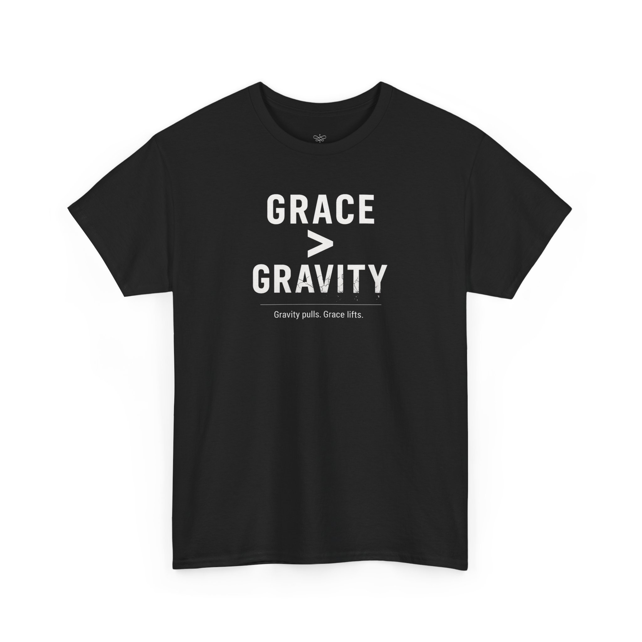 The Grace > Gravity T-shirt expresses the heart of faith — that God’s grace is stronger than any force pulling us down.