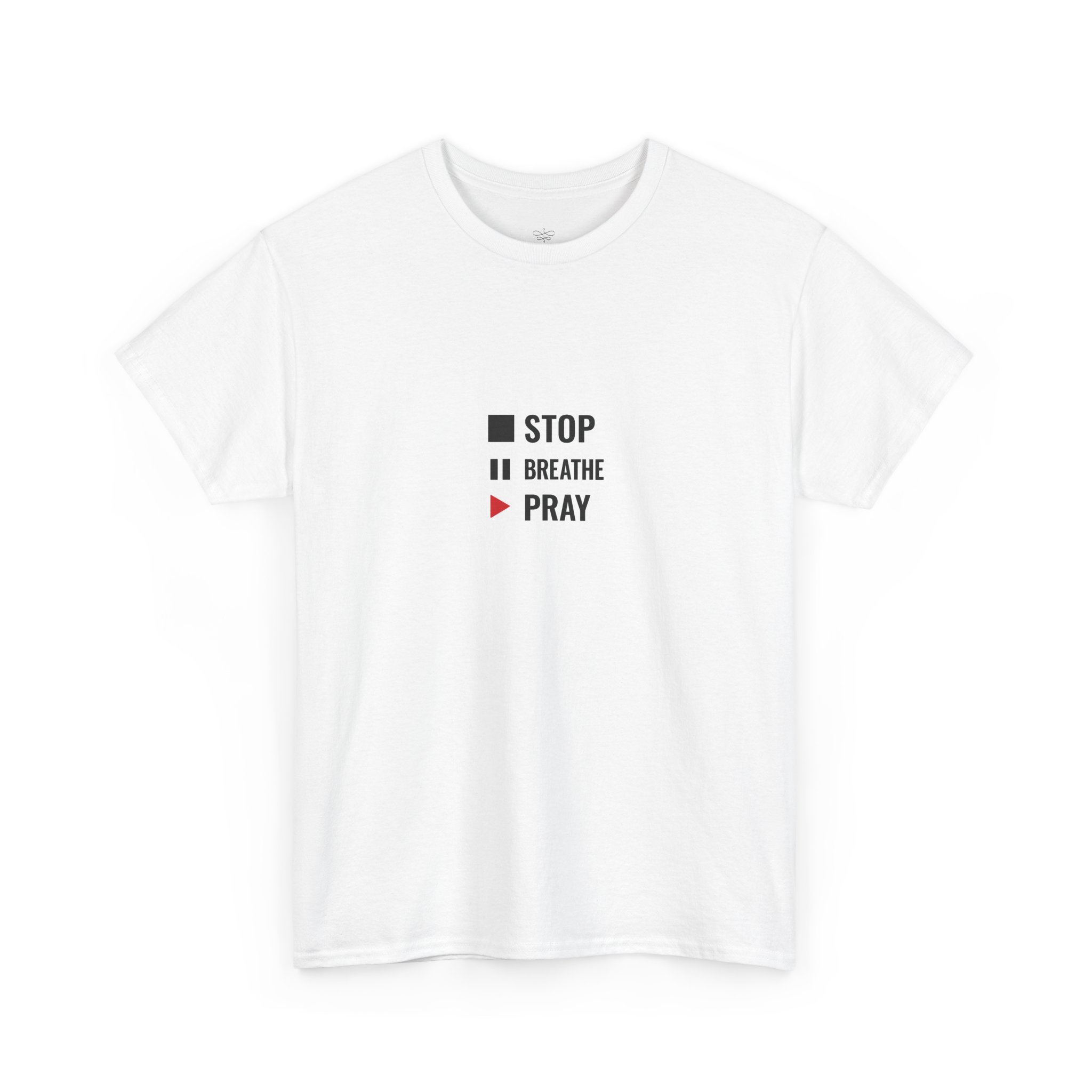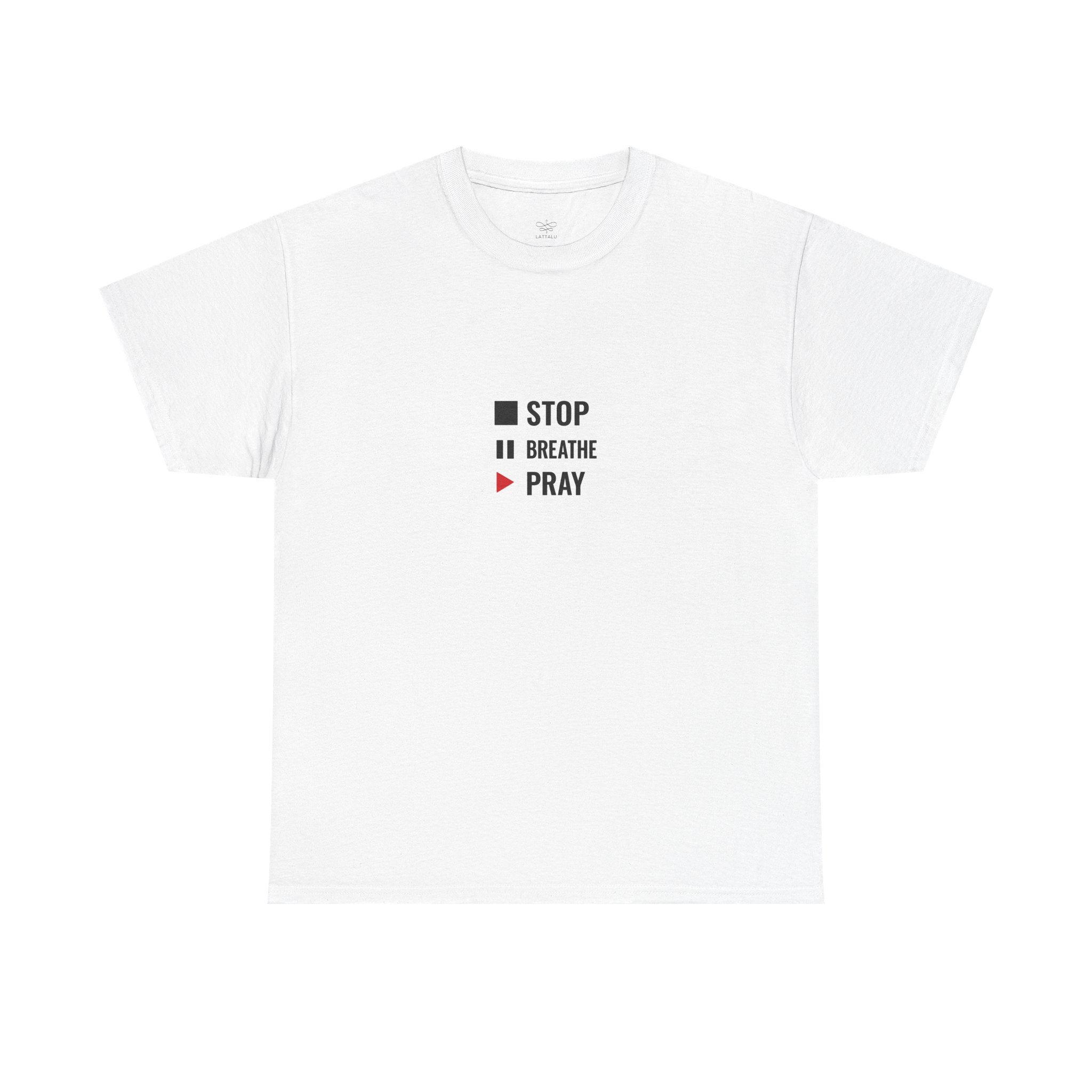The Stop. Breathe. Pray. T-shirt carries a message of simplicity, peace, and spiritual grounding.